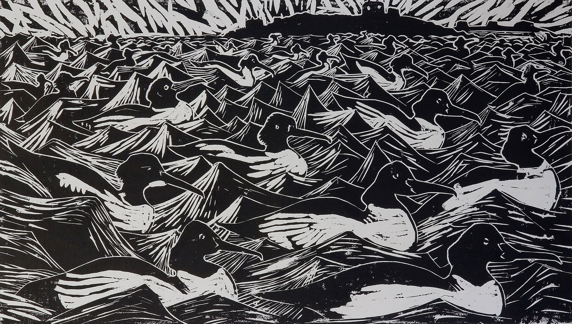 A Fleet of Mergansers, Woodcut, 48x80cm, 1998