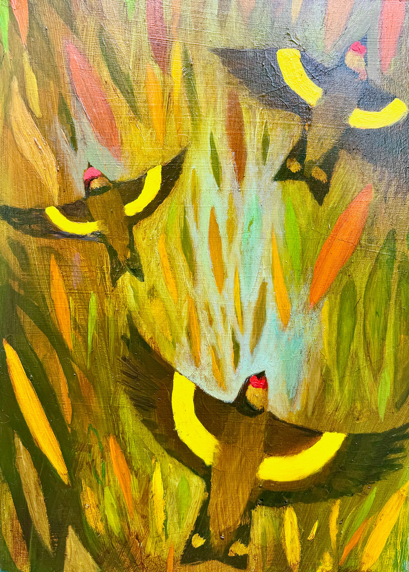 One of three paintings from the evolving sequence of oils I’m working on ‘In Search of The Green Man’ exploring the regeneration of nature in former industrial sites in The Black Country. My working method is essentially to walk around, being led wherever I’m led, seeking out beauty amongst the scarred landscapes. Beauty comes in many shapes and forms and sometimes might just be a fleeting flash of colour by a passing bird as in the case of the goldfinches which are very numerous. Sometimes it can be easy to take the common bird’s fore-granted, but goldfinches are amongst the most beautiful of British birds, which is why I always try to remember them.