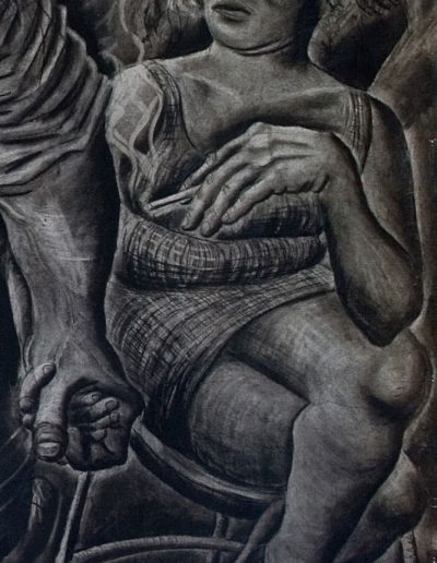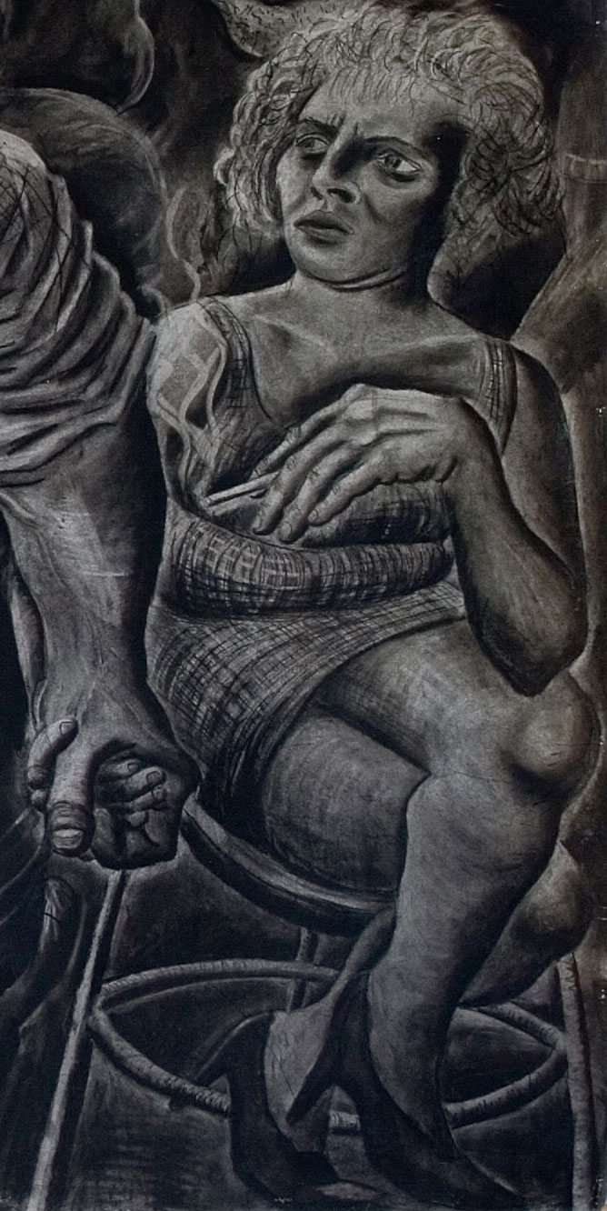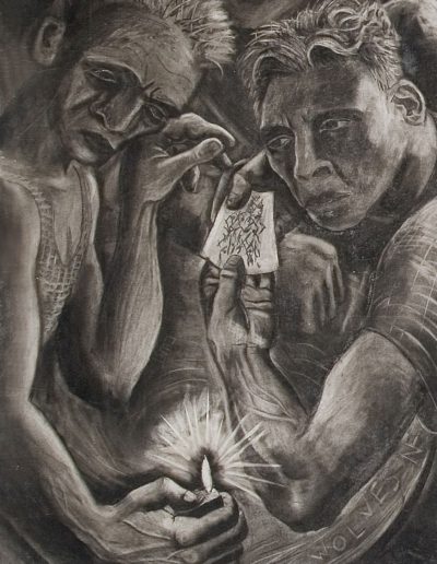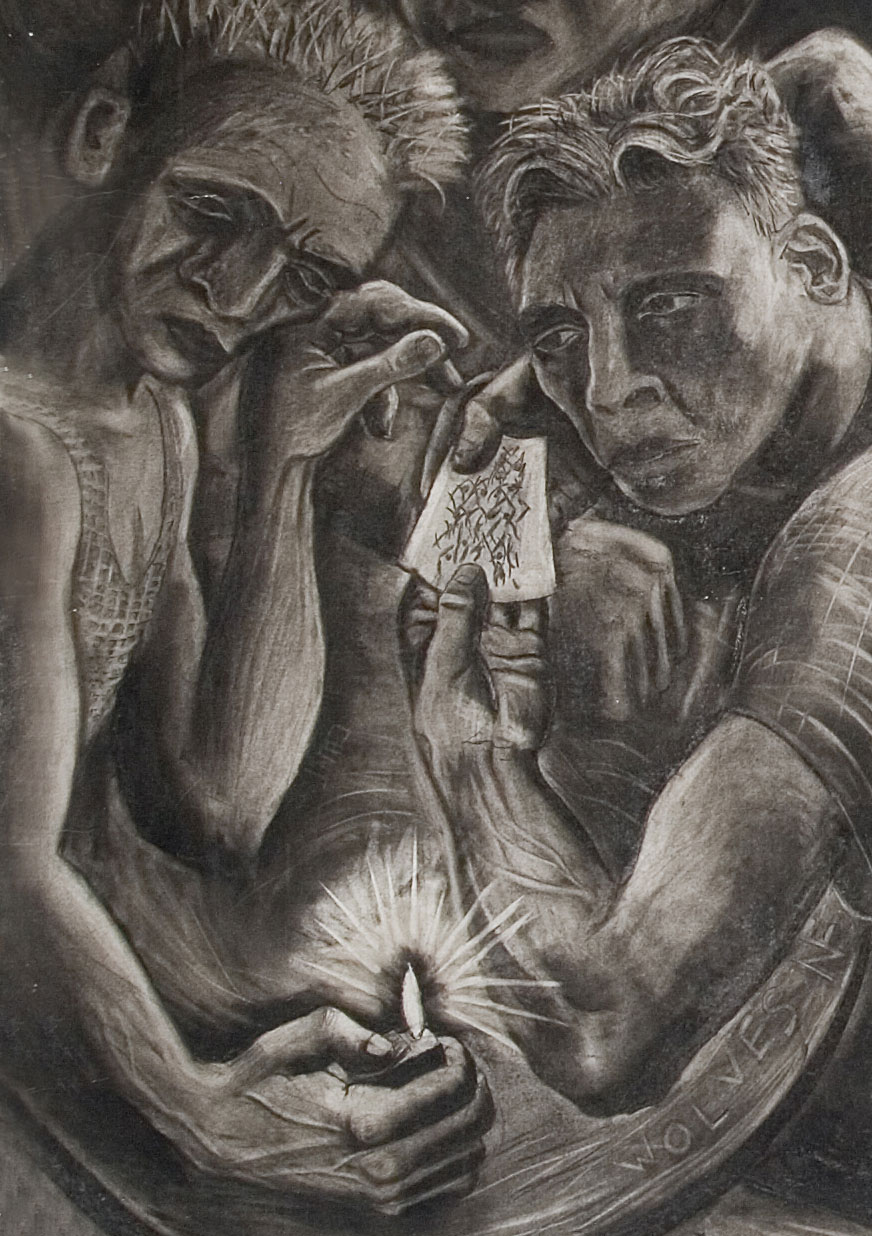These are the children of the furnace, born to work with no work to do. This is the most accurate rendition of the artist’s year group at school he could draw. The setting is the back room of a pub in Pensnett where the artist was born and within the confines of its walls people drink and smoke to oblivion. this is set in the 1980s and under Margaret Thatcher’s Tory government industry was systematically destroyed leaving large swathes of the populace unemployed as well as ripping out the center identity and community. The culture that evolved in the Black Country was ‘born to work’ forged amongst the heavy industry built from the iron steel and coal that nature had provide with abundance in the area. This is the area that was ‘black by day and red by night’ and in which people were culturally bred for heavy work. Suddenly there is no work and in this picture the void is filled with drink and drugs. The central figure earned the nickname the incredible drinking man after drinking 26 pints of Banks’s mild one Saturday lunch time and still going out in the evening. Holding his hand is the only woman in the pub; this is a staunchly male dominated venue. Next to him a man stares into a glass of vodka about to explode with rage whilst the bar man looks on with a guilty conscience. On the left a man sprinkles hashish into a joint leaning on a table that has been carved with the words Wolves NF – a visible sign of the lean towards the far right right as the disenchanted youth look for someone else to blame. Football hooliganism offers a tribal identity and gives an outlet for aggression. These are the children of the furnace except that the furnace is no more.