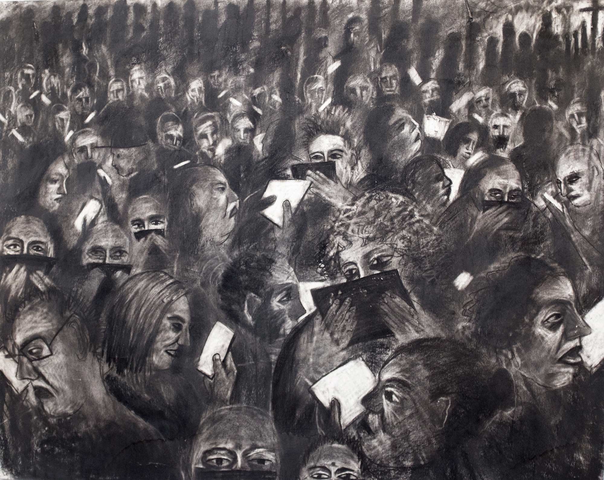 FACEBOOK VALLEY 2014Charcoal ENQUIRE Here in the valley of Facebook lonely people are being hypnotised by bright screens of disconnection. < GALLERY ← FLIGHT OF THE CURLEWS SHEEP WITHOUT A SHEPHERD →