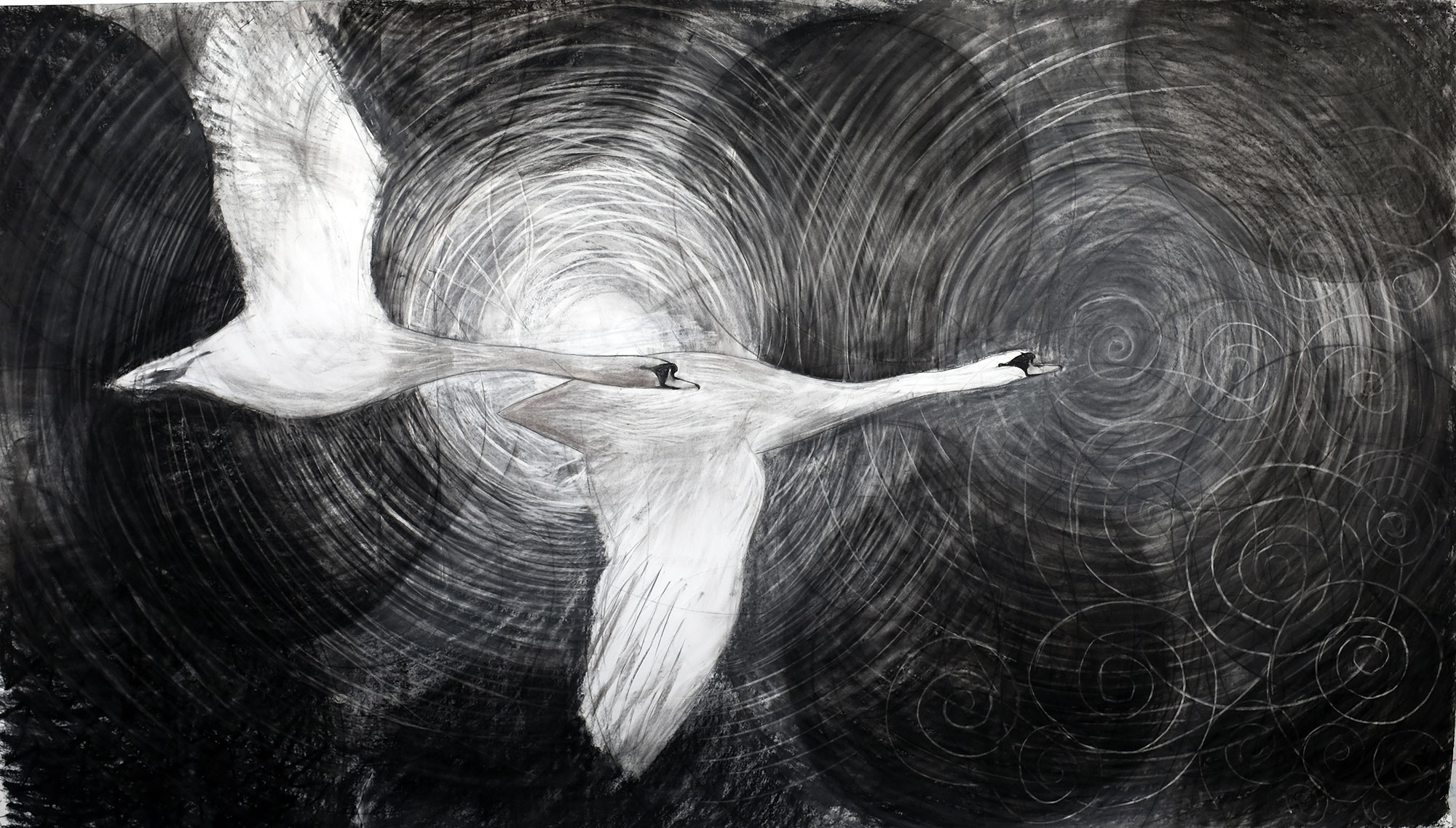 Large scale charcoal drawings made over a period of time has always been a central part of my art. These drawings enable me to work through complex and sometimes unclear things in my mind and the drawing is finished when all the visual elements make sense and the meanings become clear. This drawing is about the timelessness of love as symbolised by the connection of the swans. I wrestled with this drawing and it was only when I surrounded the beautiful white birds with the intense dark rhythmical circles that it started to make sense. These birds travel through an elemental timelessness that is at times not always easy. I don’t fully understand the meaning of this work but when first exhibited it touched the hearts of many people. I’m really glad that a large scale high quality representation of this drawing has found a permanent home in Papa Stour church so that whoever stumbles upon it might be able to think about the timeless and mysterious journey of the these two swans in the tranquillity of that beautiful island.
