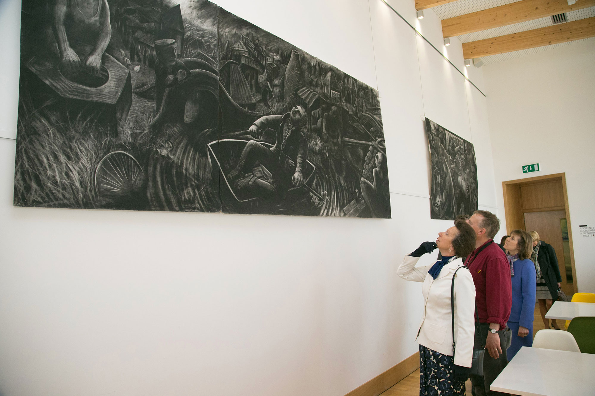 On the top of the factories is a field with a lone horse trapped in it, this is a story recounted to me by my grandfather who spent World War two making ammunition in one of the factories that was covered with pseudo grass to avoid detection from the Nazi bombers that pummelled the area. A lone figure sits beneath this field smoking cannabis to escape from the realities of the world around, or is he trying to gain insight into the world around. The glass works cone tower sits like a steeple reaching skywards giving a focal point of identity and purpose in the making of glass. Below this an exhausted man reaches out to a Coot that is paddling away. This man is trying to touch and reconnect with nature in some way but the industrial colonization and domination of the land all around keeps the bird just out of reach. Above this man a group of people gather round a body, these are members of the national front who have just killed a personal friend , a fine man of Jamaican descent who was chased by a gang of skinheads and died of an asthma attack. The air all around is heavy but on the horizon a bright light breaks through illuminating everything with its glow.