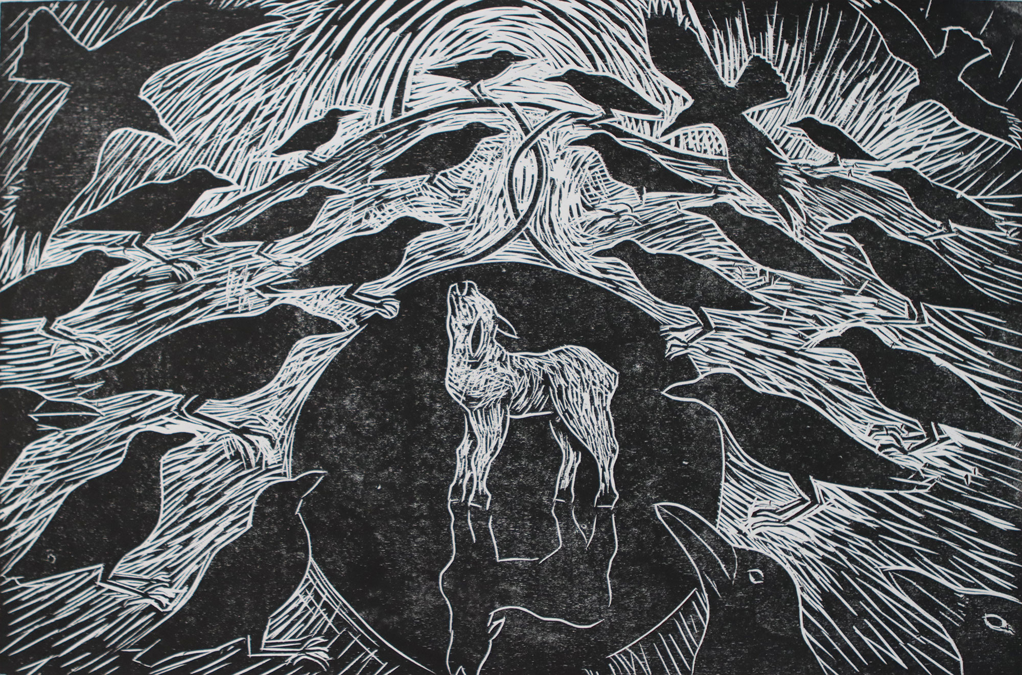 Shetland has a large population of ravens, locally known as corbies and in spring an even larger population of lambs. Ravens being opportunistic feeders and will gather where ever there is the chance of food which is plentiful at lambing time and as such they have been heavily persecuted. Paradoxically they are also highly revered in Nordic culture and the raven flag flies proudly over the town hall in Lerwick. This print is not about heroes and villains but about something bigger than both raven or lamb.