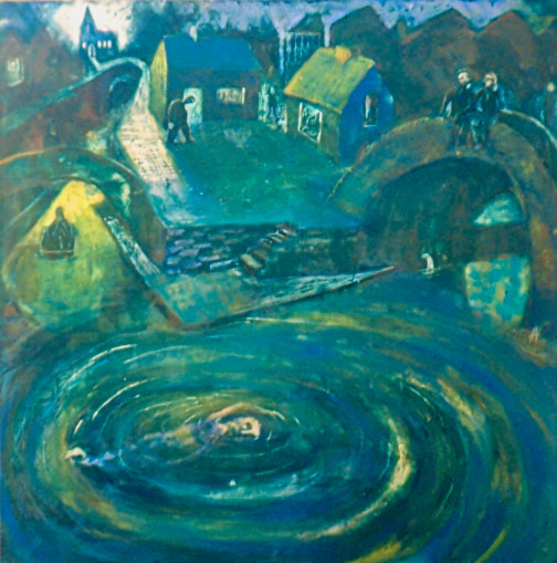 Night swim is inspired by a very oppressive dream of swimming in a polluted canal which is something I used to do as a youth. The swimmer gasps for air , struggling to move in the heavily laden polluted water that envelopes his spirit. The industrially tainted water leeching through the pipes makes the water ever more sicker but courting couple on the bridge offer a promise of new life. The stooped man staggers to work in the factory whilst the light from the church illuminate the land and water pointing to a different way away that we have long since forgotten.