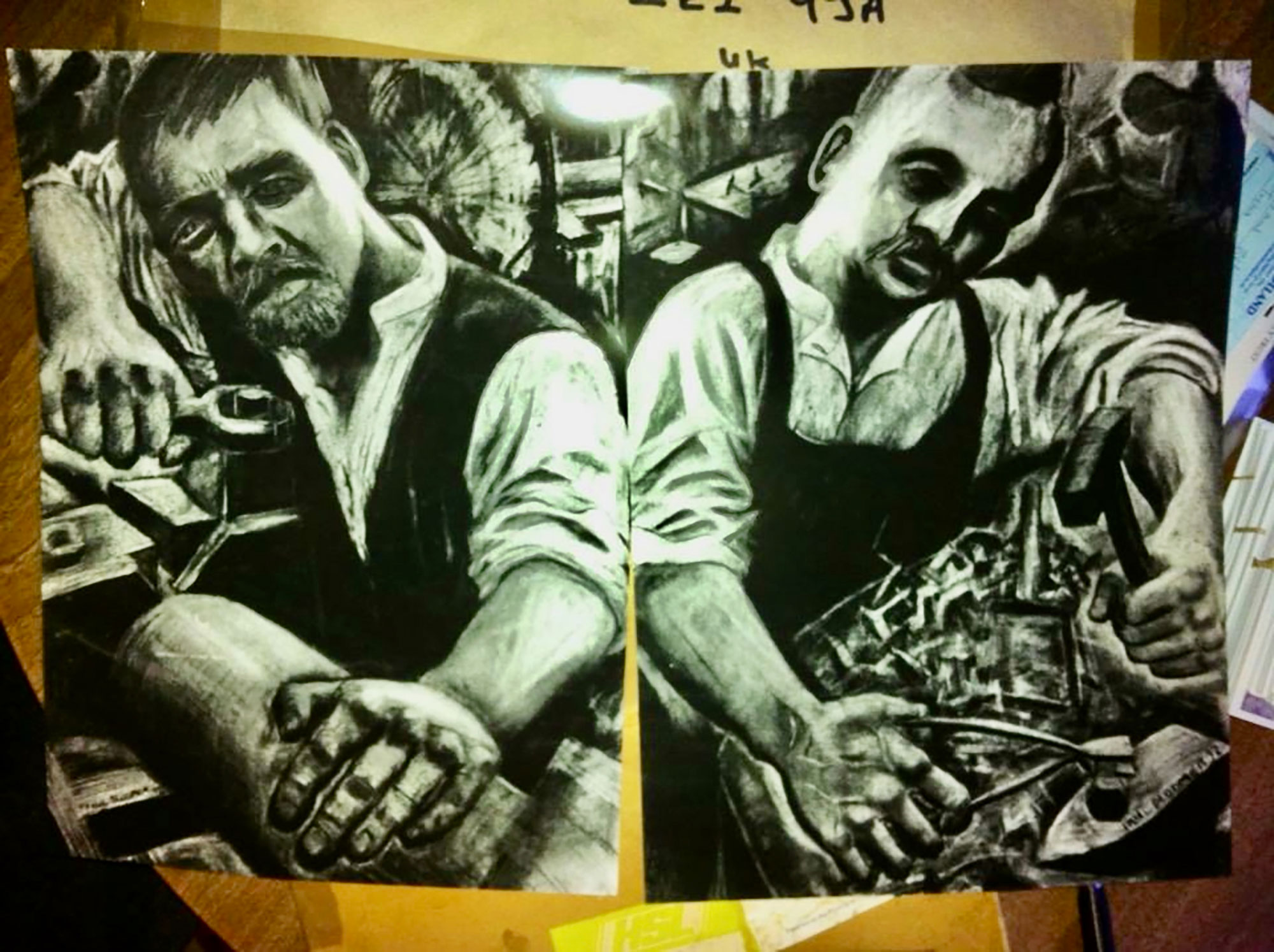 PORTRAIT OF TWO BLACK COUNTRY MEN 1994 Charcoal A1 paper ENQUIRE This is a photograph of two commissioned drawings of the Black Country ancestors of a man from America, one of whom worked as a chain maker and one of whom worked as an axle grinder. < GALLERY ← CARRY GO BRING COME THE MAD RIDER →