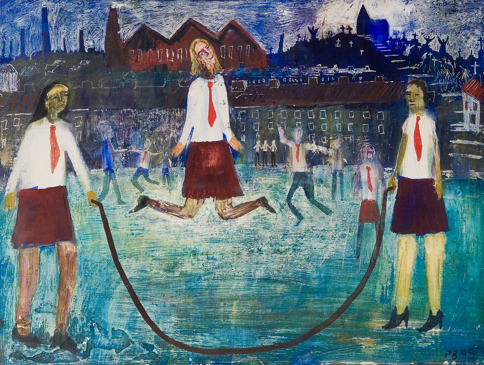 The skipping figure is inspired by the purity of spirit my young niece embodied whilst all around threats loom heavy.