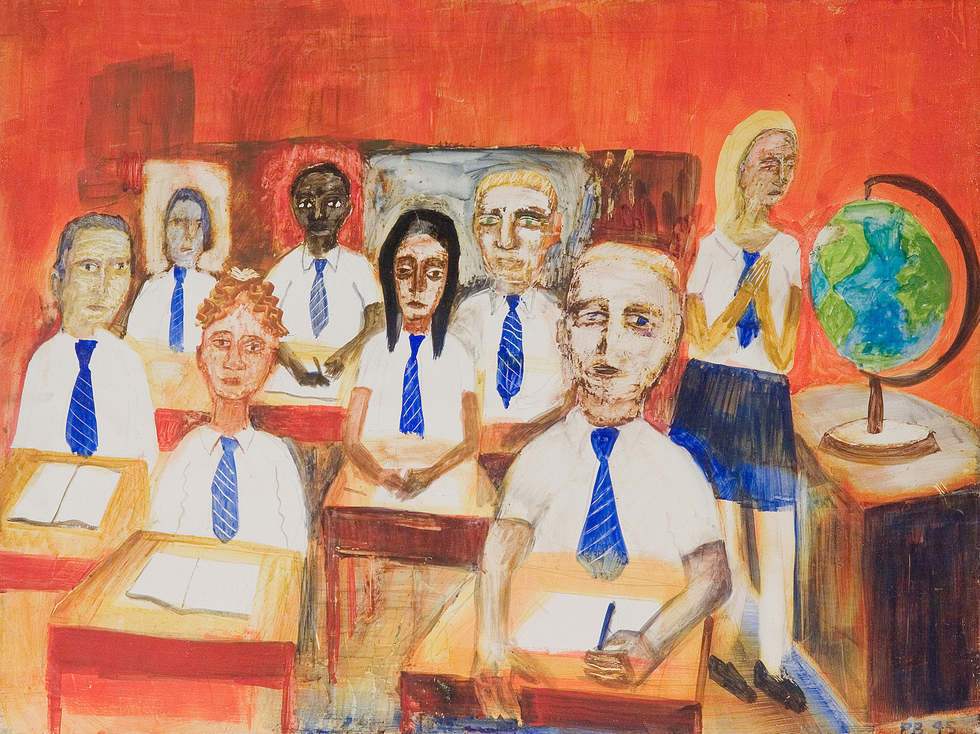SCHOOL DAZE 2 1995 Egg tempera 46x60cm, 1995 ENQUIRE Loosely inspired by my own school days , here pupils stare blankly and numbly ahead, dazed and confused, whilst a lone girl prays for the world. < GALLERY ← LAMENTATIONS SCHOOL DAZE 1 →