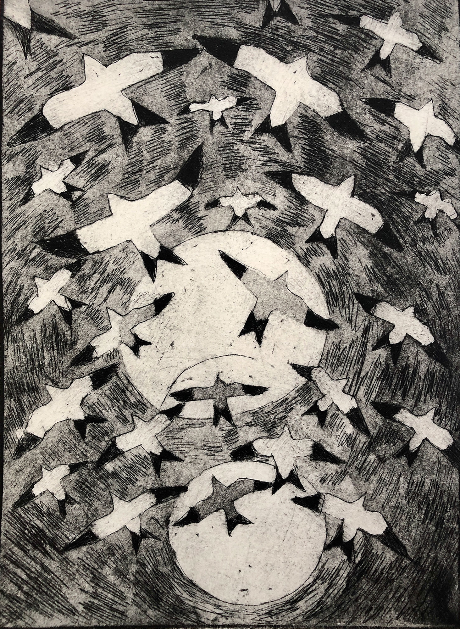 Snow Buntings Etching ENQUIRE Fading winter sun carries heart beats below the horizon Snow buntings lift carrying light on their wings A promise of new life to come < GALLERY ← Moon Tide Haegri →