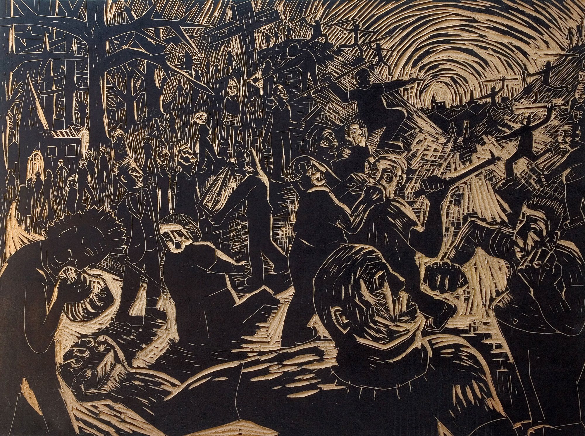THE BATTLE 1995Woodcut92x122cm ENQUIRE This print was inspired by the gang fights that took place between Pensnett and Russell hall on the the top of Barrow Hill the I was growing up. < GALLERY ← A WING AND A PRAYER THE DOGGERS →