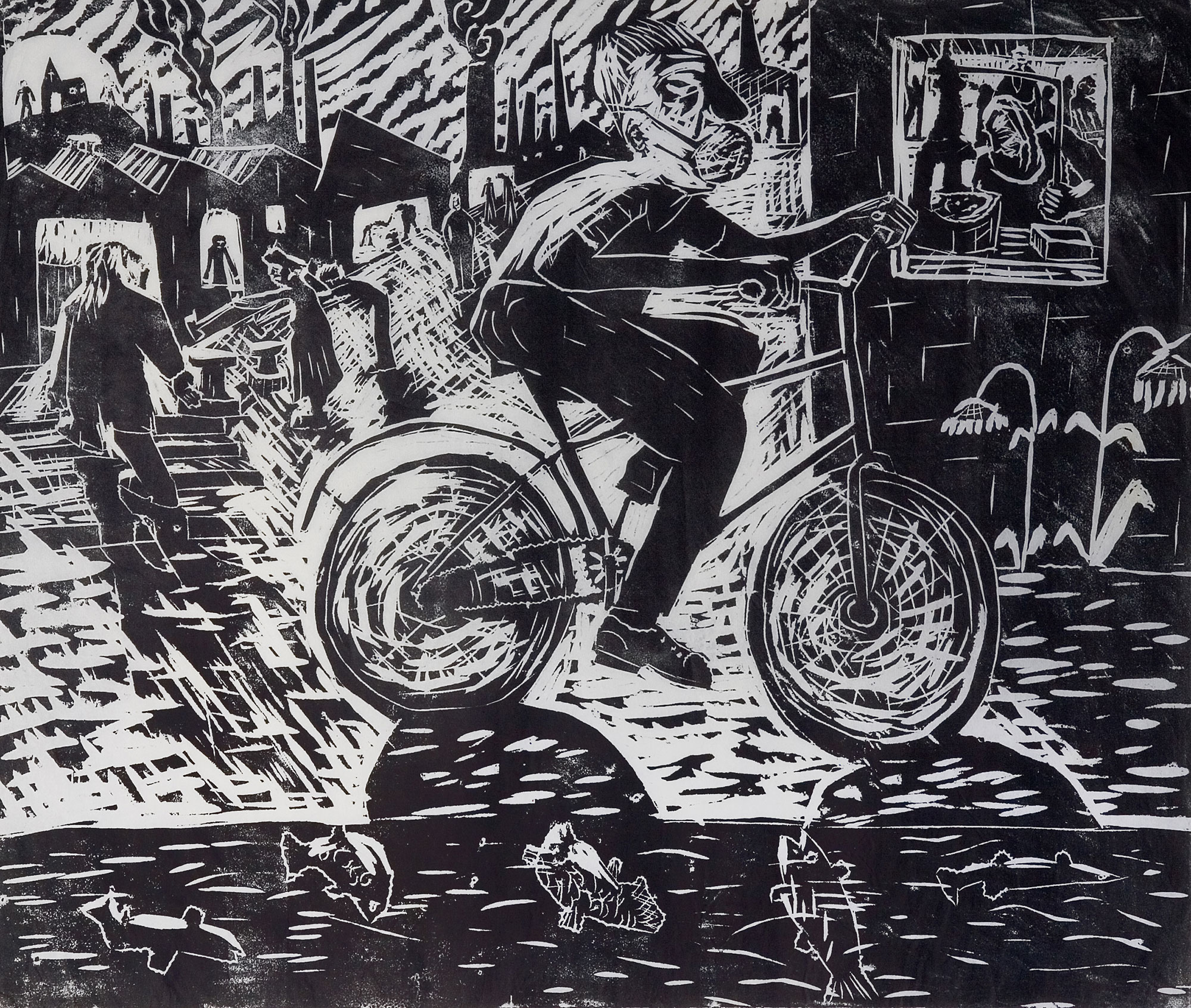 ‘The fish Were Dead’ was inspired by a cycle trip along a Black country canal, where in the rainbow sheen of oily water , I saw a shoal of silvery fish. I stopped to look closely, and I realised that all the fish were dead. This print marks one of the starting points to a growing eco awareness, that was very much underpinned by spirituality and especially the biblical mandate of ‘speaking up for those that cannot speak for themselves ‘ .