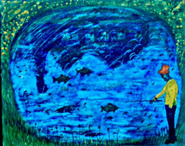 This painting was in part inspired by the character of Dostoyevsky’s ‘Idiot’ , who embodies the sufferings of the pure in spirit in a world of moral collapse and decay .The values the ‘Idiot ‘ embodies does not fit values of the dominant industrial culture around, but still the spirit of the idiot glows brightly in luminous colours that contrast the drabness of the reflected factory. The water offers promise of life as the fish swim freely.