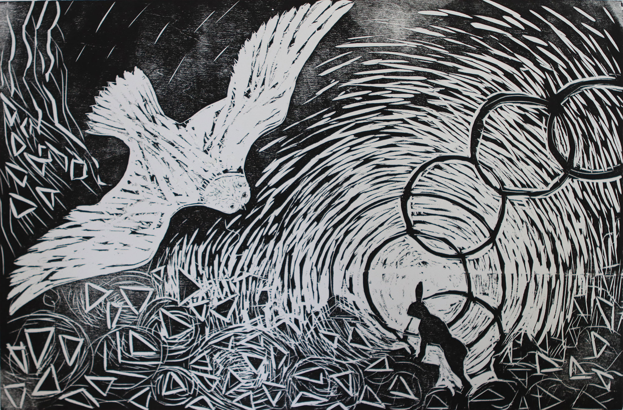 Over the last few years, I have had some very close encounters with a snowy owl that has been visiting a remote part of Shetland. The owl has been reappearing in my dreams and here the presence of the owl looms large in this wild elemental landscape where it lives in a symbiotic relationship with the hares. Illuminated by the nonlinear cycles of the moon the white granite rocks come alive in crystalline shards of life, offering shelter for both. I am reminded that the owl and hare breath the same cool night air that we do.