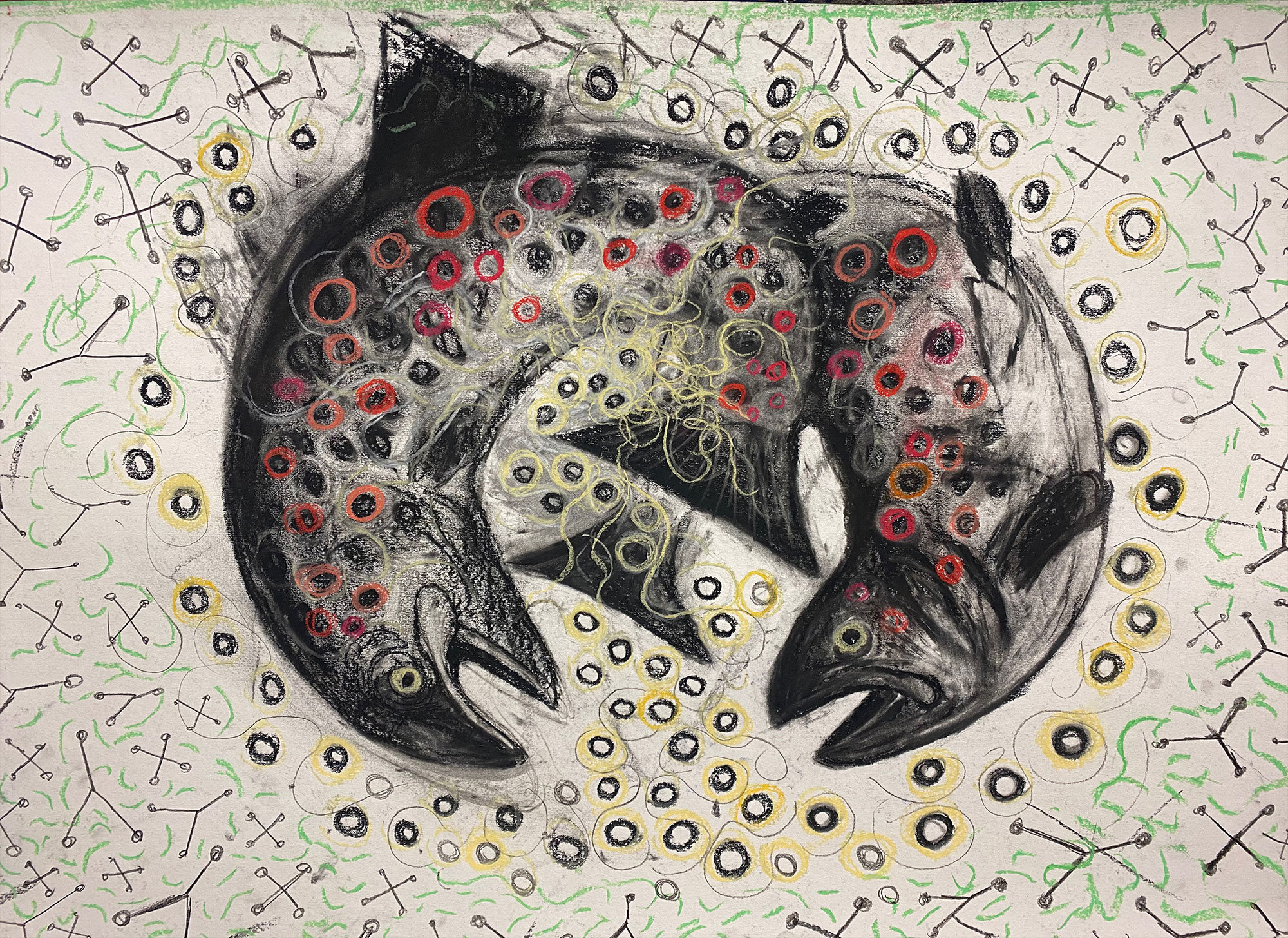 In this drawing these two fish dance their dance of life that they have been doing for millennia, and in some areas the populations of trout will have been there thriving since the last ice age. It’s a tragedy beyond tragedy that within a very short time all over the world our water has been polluted, changed and used as dumping grounds, creating a carpet of death that carries the other than human life with it. Water is so important to all life including ourselves, for Without water there is no life, but still, we use and abuse it. Here these two fish are surrounded by encroaching nitrates and phosphates and the algae is starting to multiply, but still, they dance in that elemental urge to come together in the creation and continuation of life.