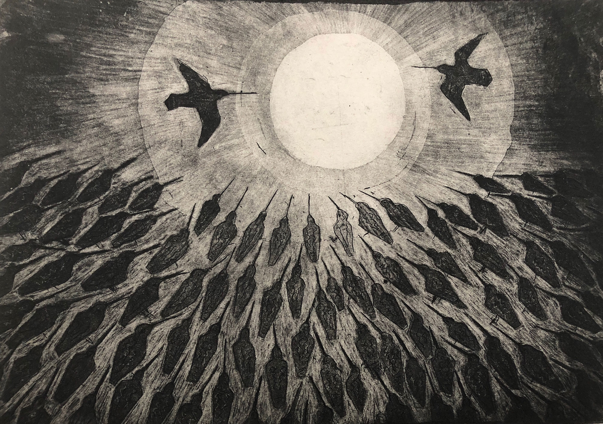 Wing Song Etching ENQUIRE In simmer dim gloaming these snipe dance Their wings sing thanks for the light < GALLERY ← Flight Layers of time →